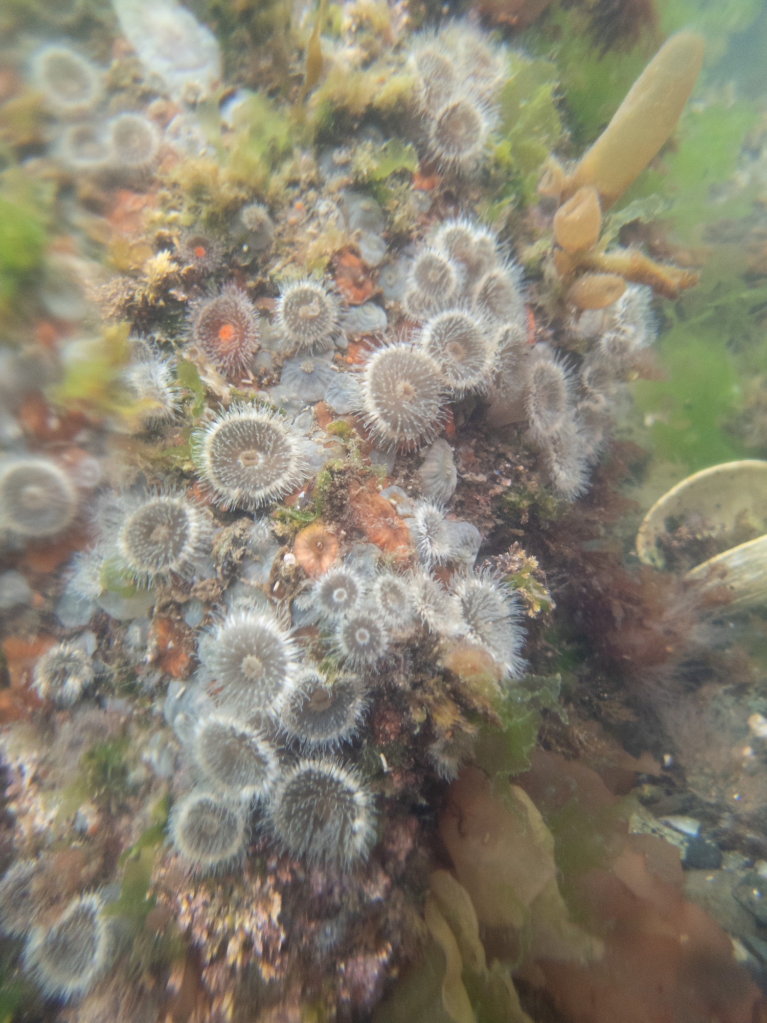 This is a somewhat weird angle for plumose anemone - you don't often look down on their faces like this. The tentacles on the face really separate these from other anemone like green sea anemone.