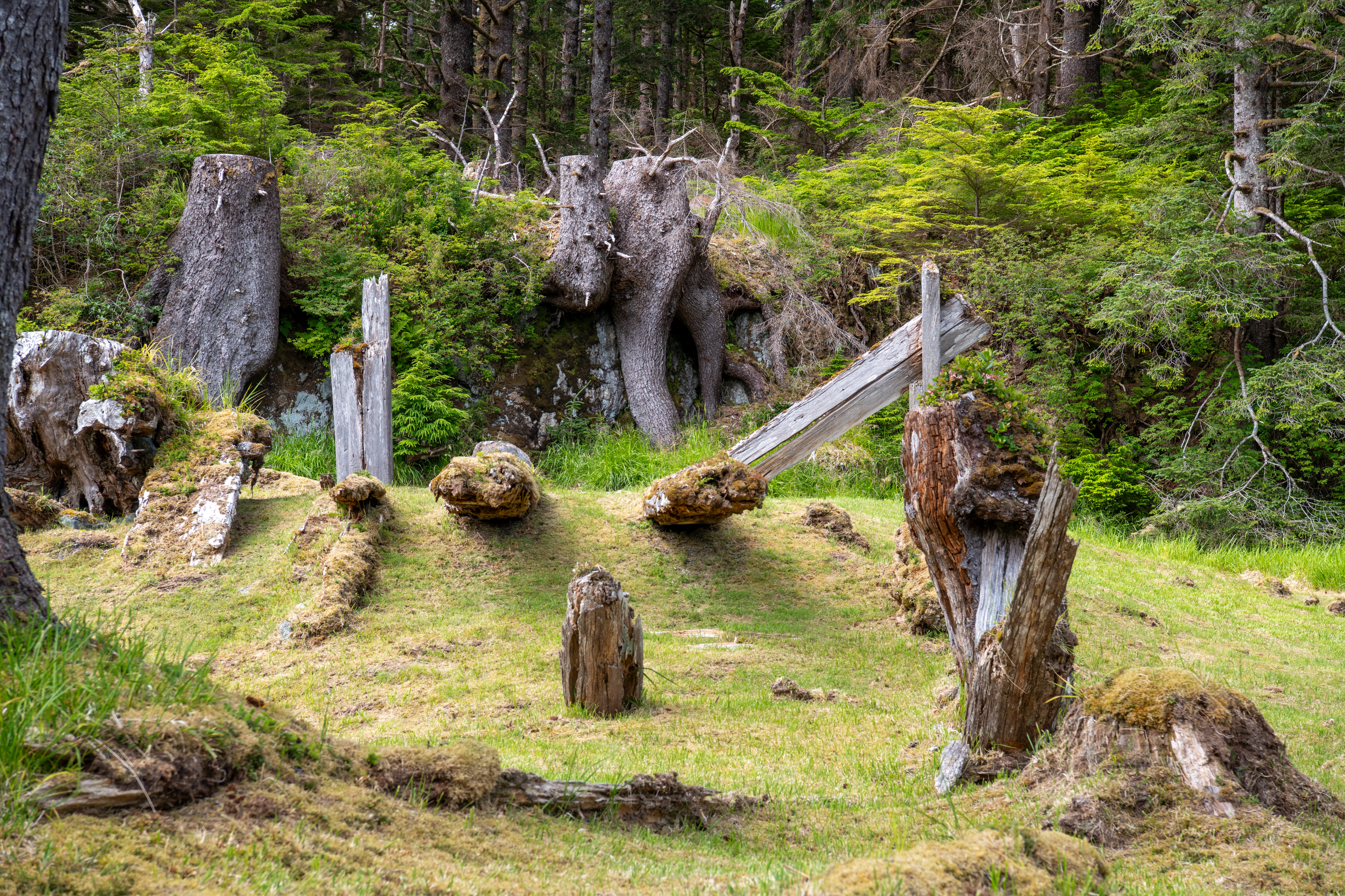 John Harvey Photo > John's Overnight Page > Haida Gwaii > SGang Gwaay > Collapsed House With Corner Poles