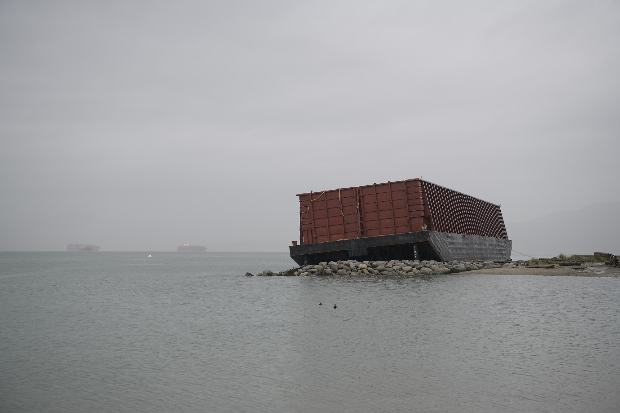 I believe the rocks are part of the groyne used to preserve the beach. This barge normally holds sawdust and broke away during a storm.