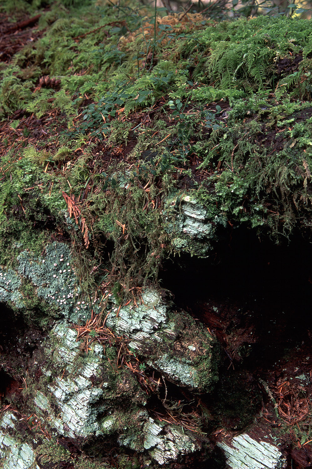 This is a fallen cedar and it's covered in many different types of mosses. It